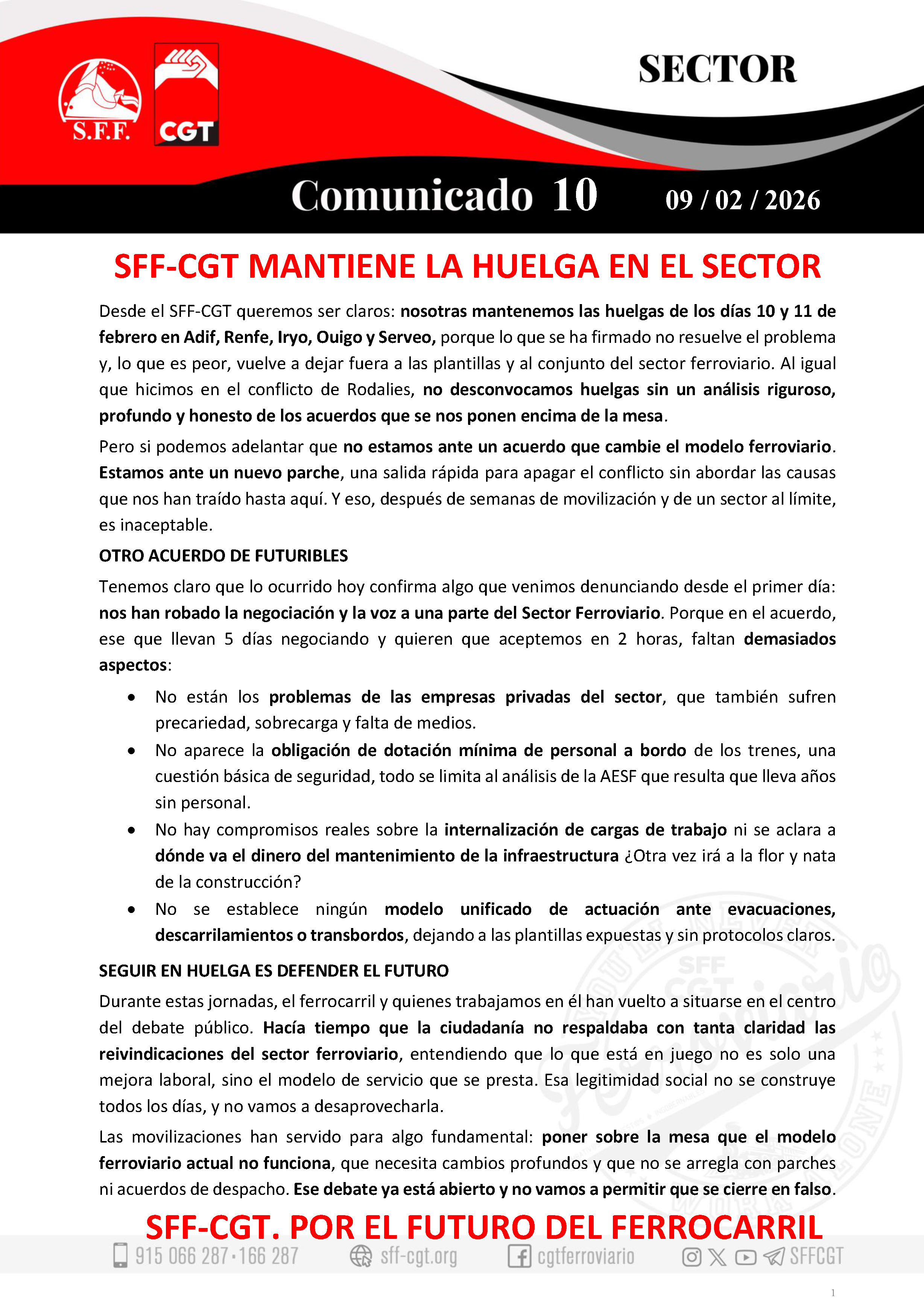 Desde el SFF-CGT llamamos a todas las personas trabajadoras del sector ferroviario a secundar estas jornadas de huelga, aunque el sindicato al que esté afiliado/a no convoque, y a participar también en las concentraciones que se realizarán en los distintos territorios. Porque esta movilización no va de siglas. Va de seguridad y futuro del sector ferroviario.