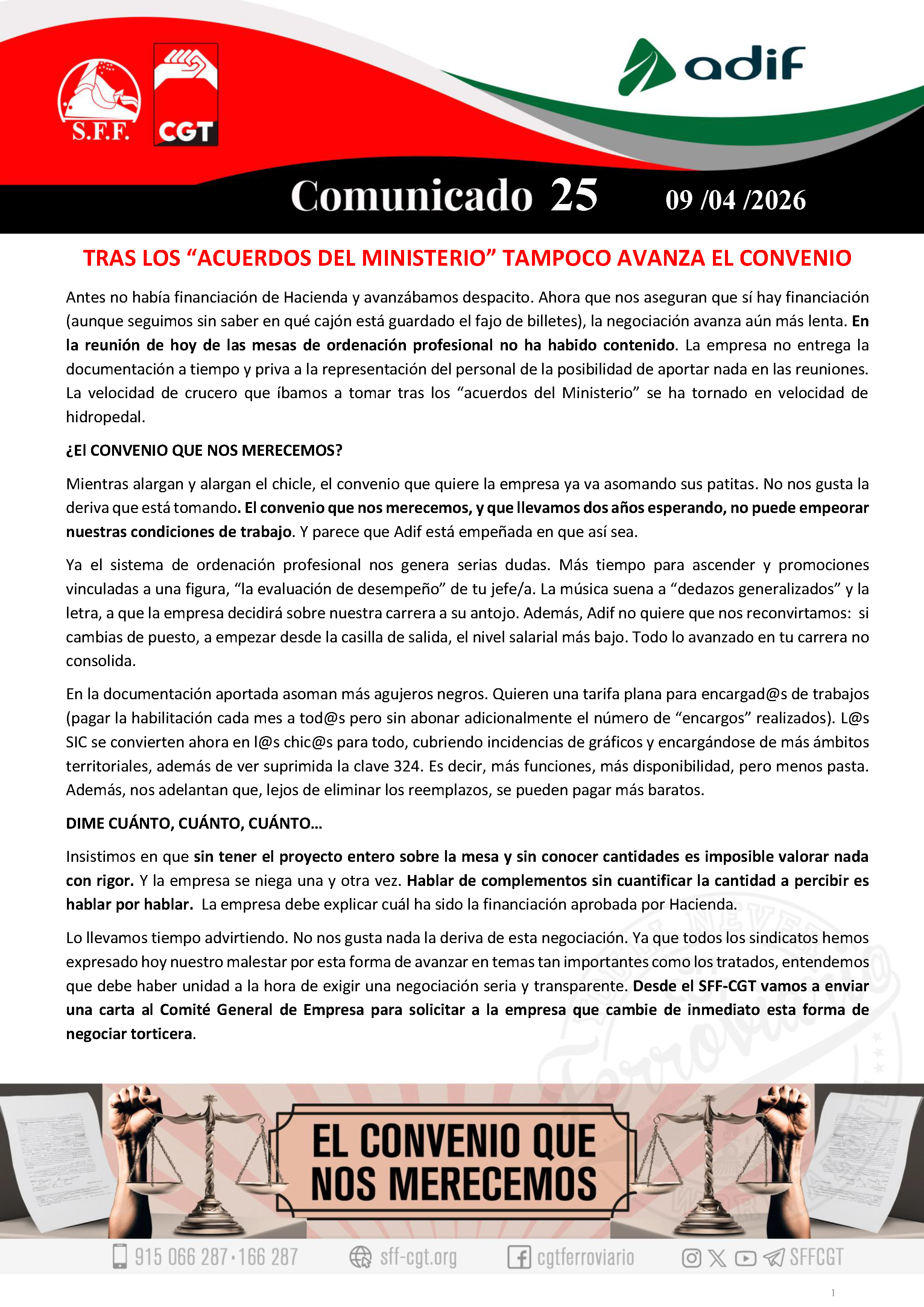 Lo llevamos tiempo advirtiendo. No nos gusta nada la deriva de esta negociación. Ya que todos los sindicatos hemos expresado hoy nuestro malestar por esta forma de avanzar en temas tan importantes como los tratados, entendemos que debe haber unidad a la hora de exigir una negociación seria y transparente. Desde el SFF-CGT vamos a enviar una carta al Comité General de Empresa para solicitar a la empresa que cambie de inmediato esta forma de negociar torticera.