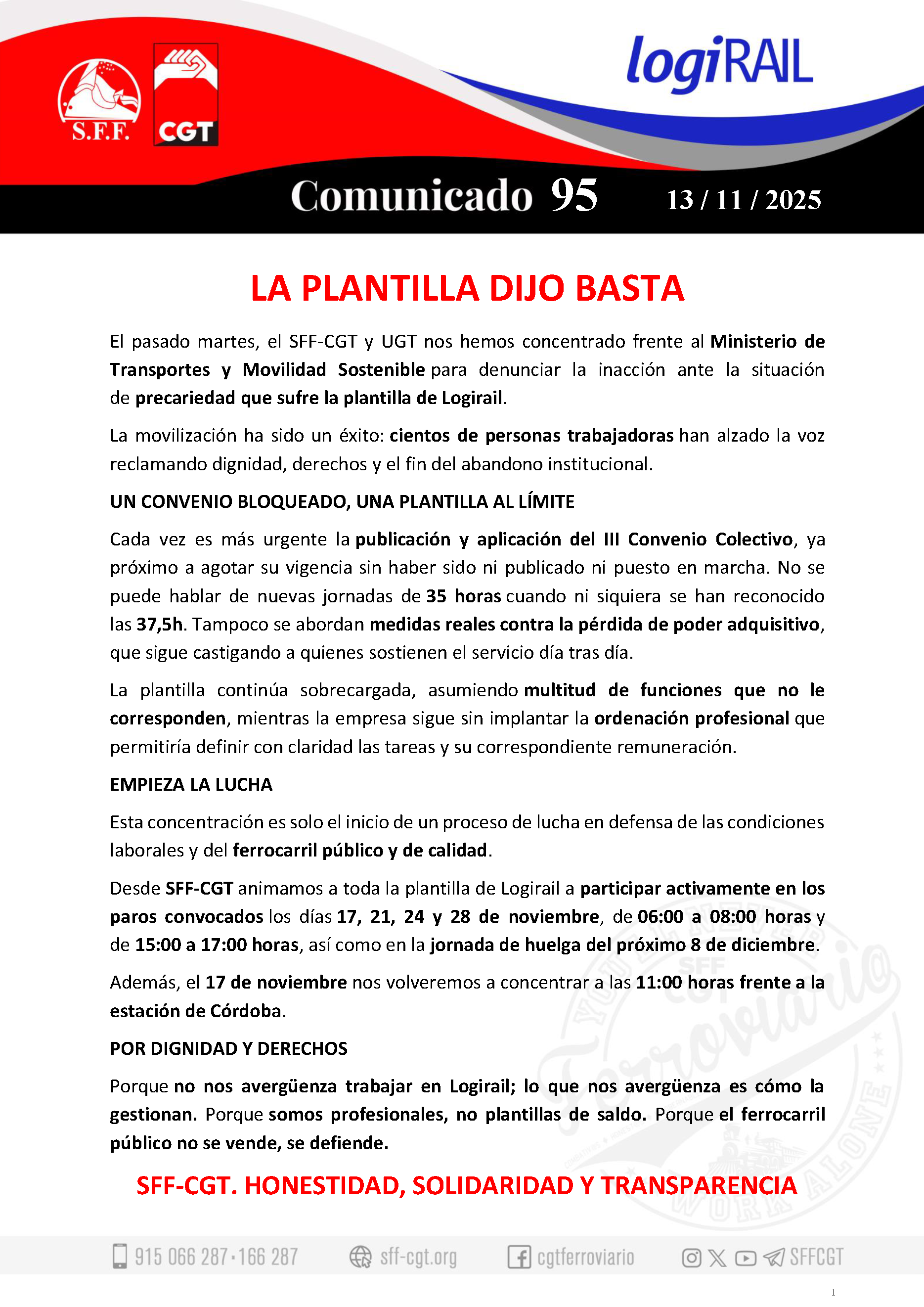 ADIF 11/11/2025 | 93 EL SFF-CGT PRESENTA UNA COMISIÓN DE CONFLICTOS POR LA PARÁLISIS DEL III CONVENIO | LOGIRAIL 06/11/2025 | 92 SALARIOS DE OUTLET, DIRECCIÓN DE LUJO |