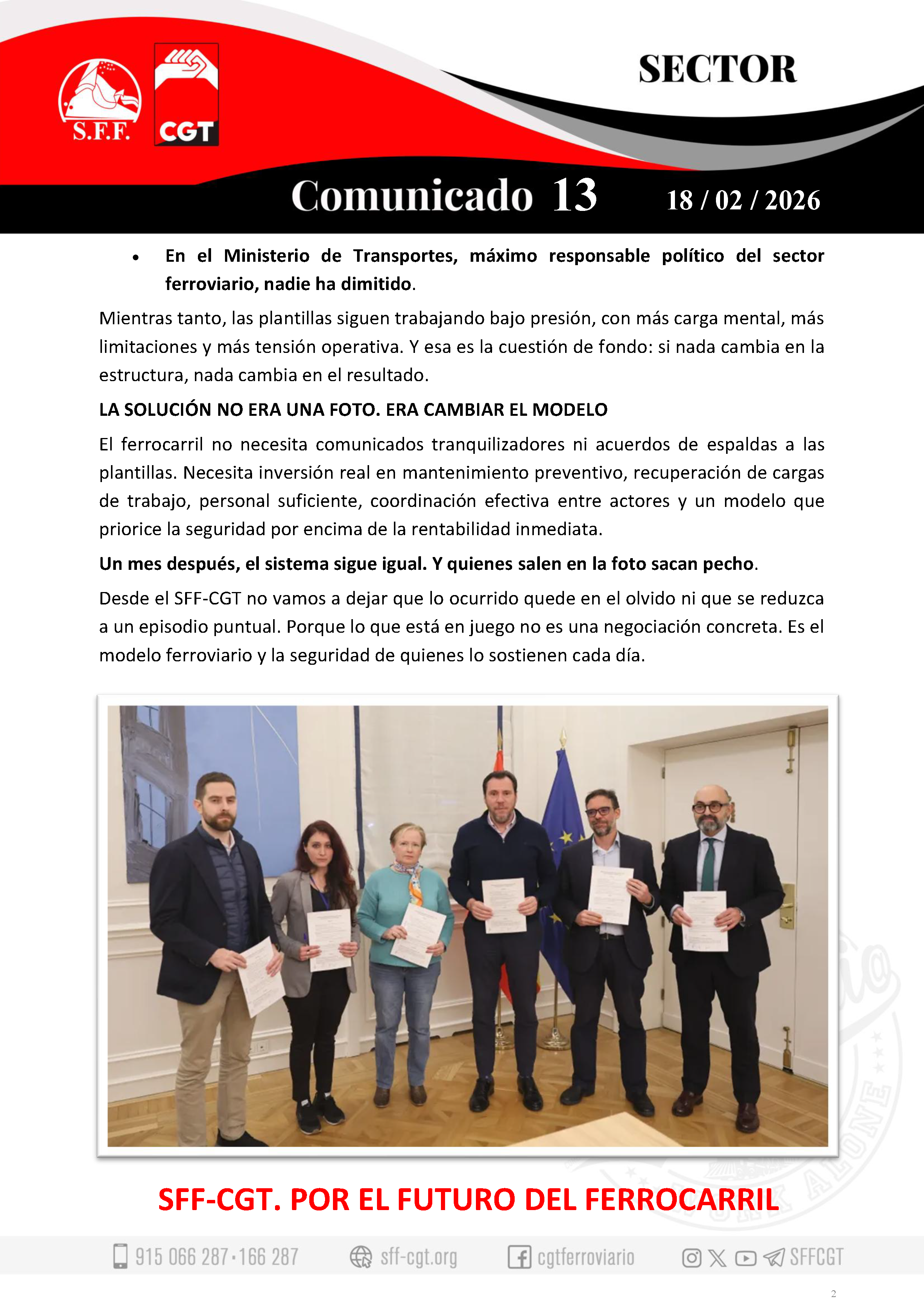 Desde el SFF-CGT no vamos a dejar que lo ocurrido quede en el olvido ni que se reduzca a un episodio puntual. Porque lo que está en juego no es una negociación concreta. Es el modelo ferroviario y la seguridad de quienes lo sostienen cada día.