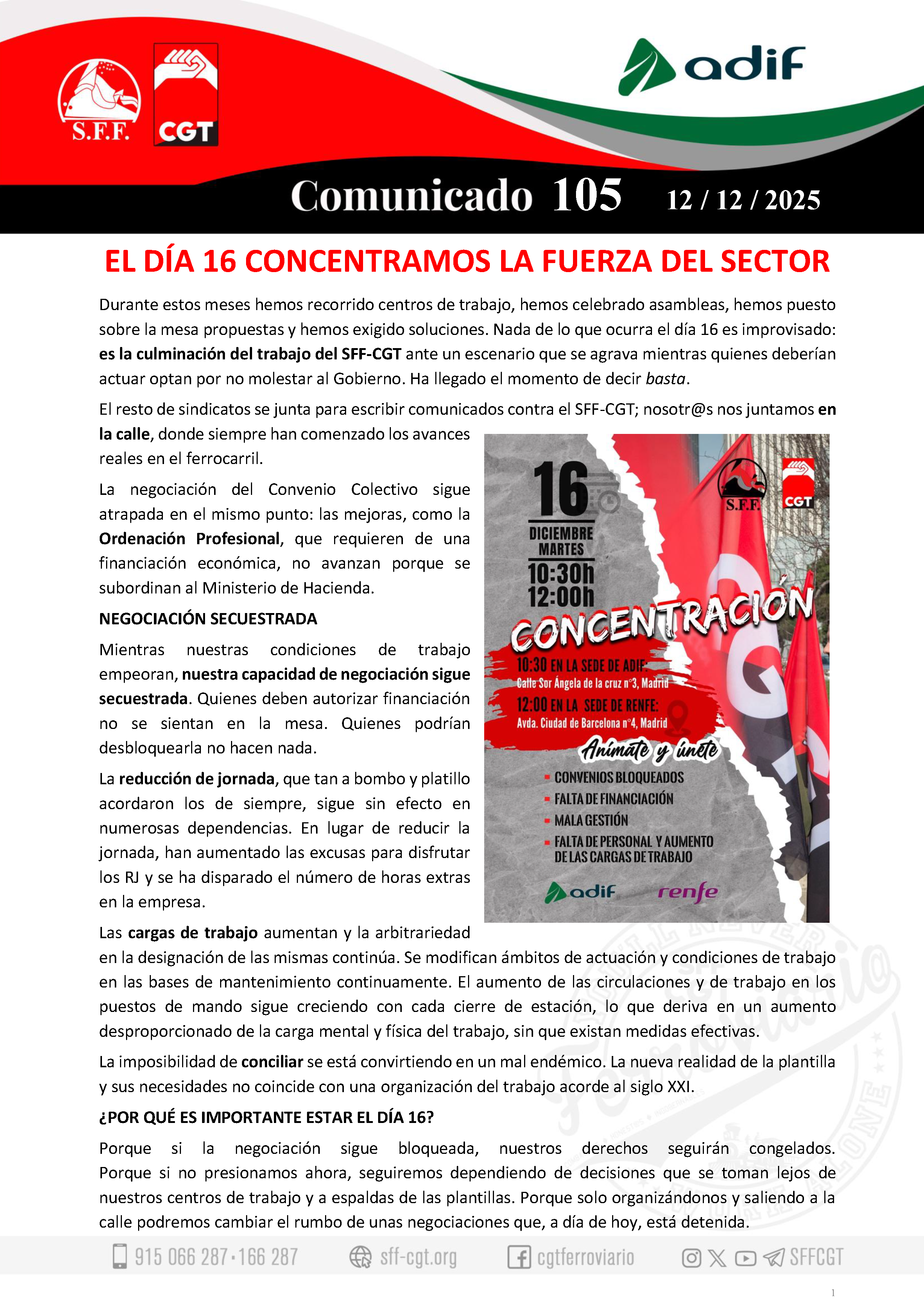 RENFE 12/12/2025 | 104 EL DÍA 16 CONCENTRAMOS LA FUERZA DEL SECTOR | RENFE 09/12/2025 | 103 REUNIÓN COMISIÓN NEGOCIADORA IV CONVENIO COLECTIVO G. RENFE |