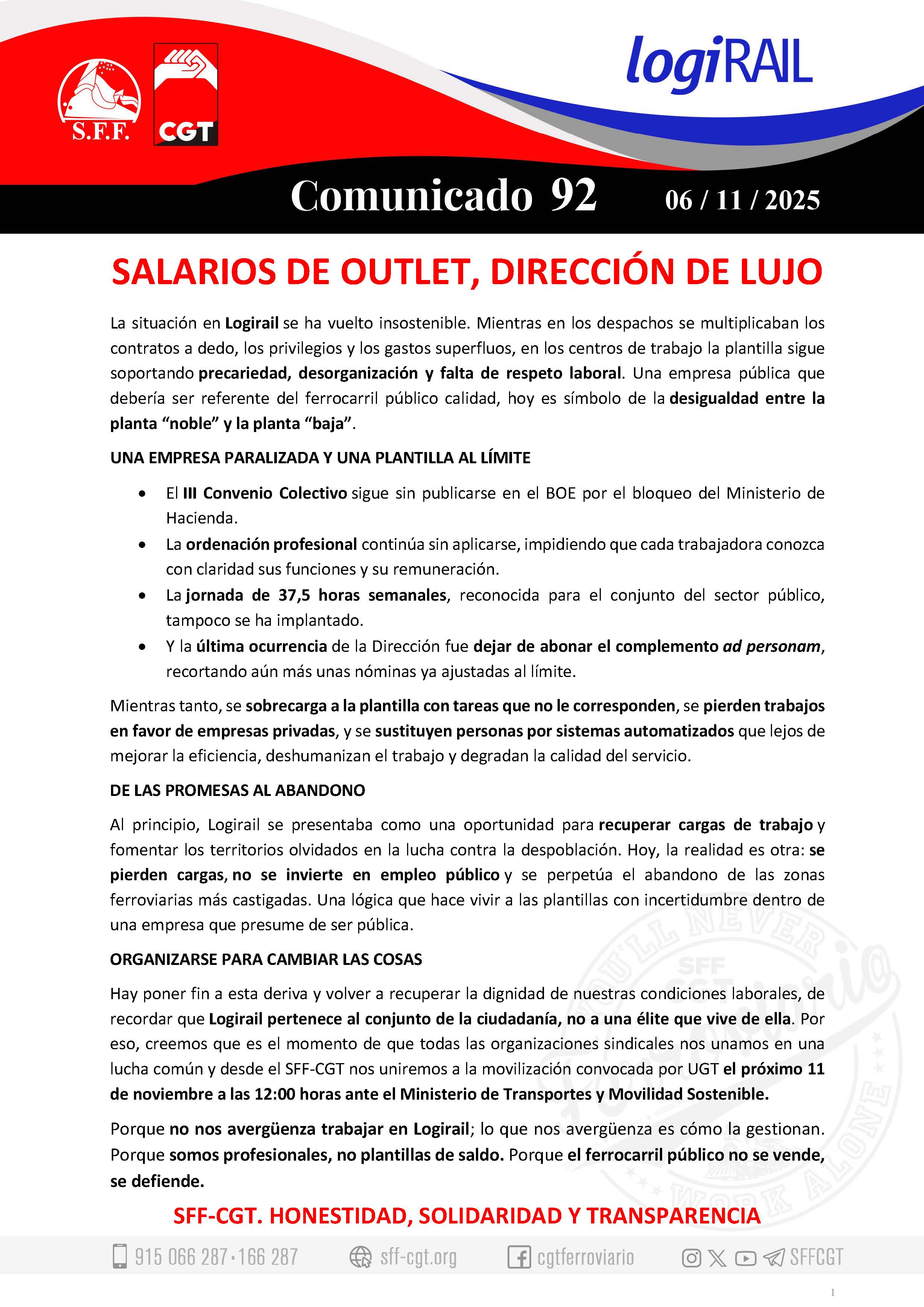 Hay poner fin a esta deriva y volver a recuperar la dignidad de nuestras condiciones laborales, de recordar que Logirail pertenece al conjunto de la ciudadanía, no a una élite que vive de ella. Por eso, creemos que es el momento de que todas las organizaciones sindicales nos unamos en una lucha común y desde el SFF-CGT nos uniremos a la movilización convocada por UGT el próximo 11 de noviembre a las 12:00 horas ante el Ministerio de Transportes y Movilidad Sostenible.