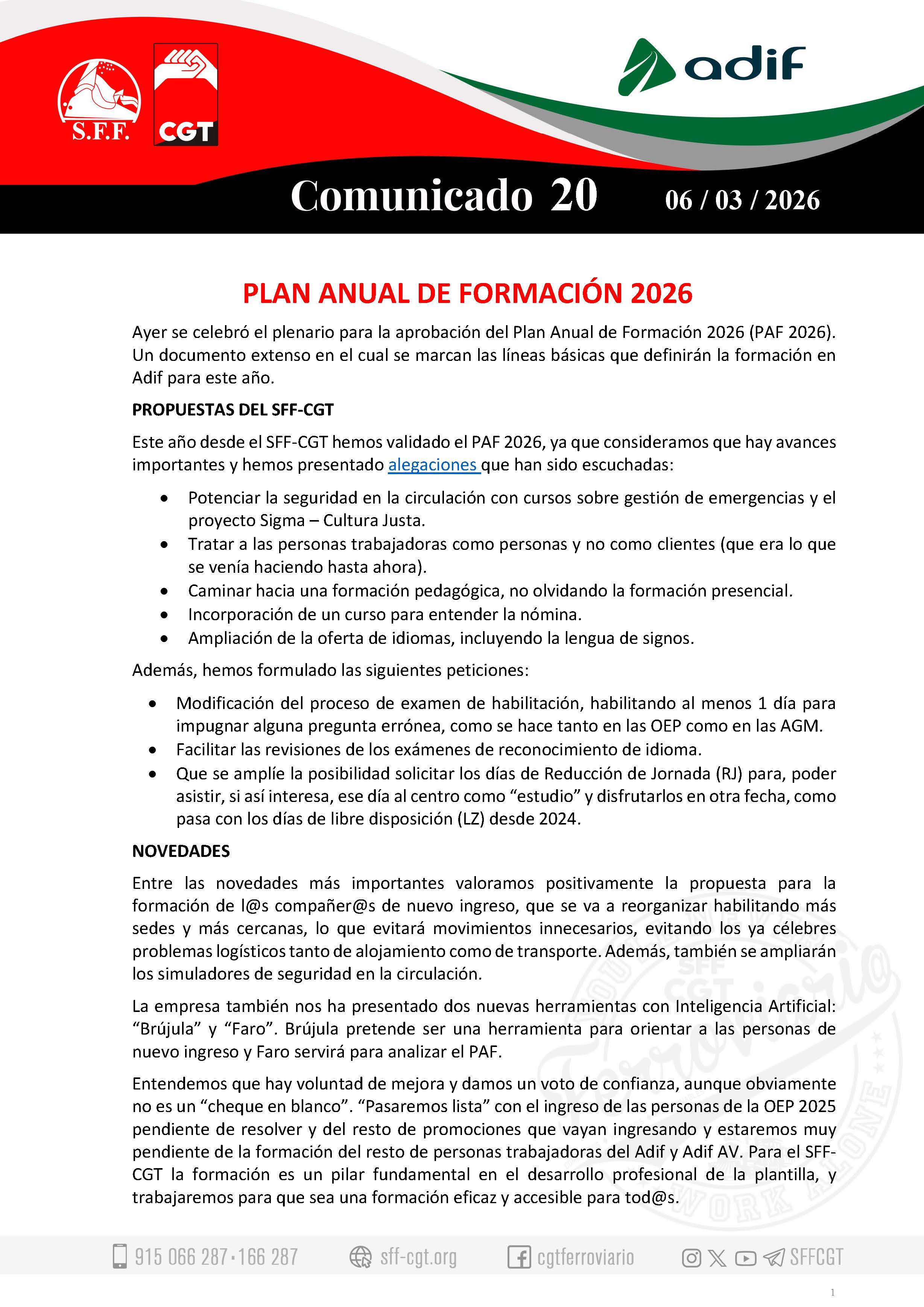 Entendemos que hay voluntad de mejora y damos un voto de confianza, aunque obviamente no es un “cheque en blanco”. “Pasaremos lista” con el ingreso de las personas de la OEP 2025 pendiente de resolver y del resto de promociones que vayan ingresando y estaremos muy pendiente de la formación del resto de personas trabajadoras del Adif y Adif AV. Para el SFF-CGT la formación es un pilar fundamental en el desarrollo profesional de la plantilla, y trabajaremos para que sea una formación eficaz y accesible para tod@s.