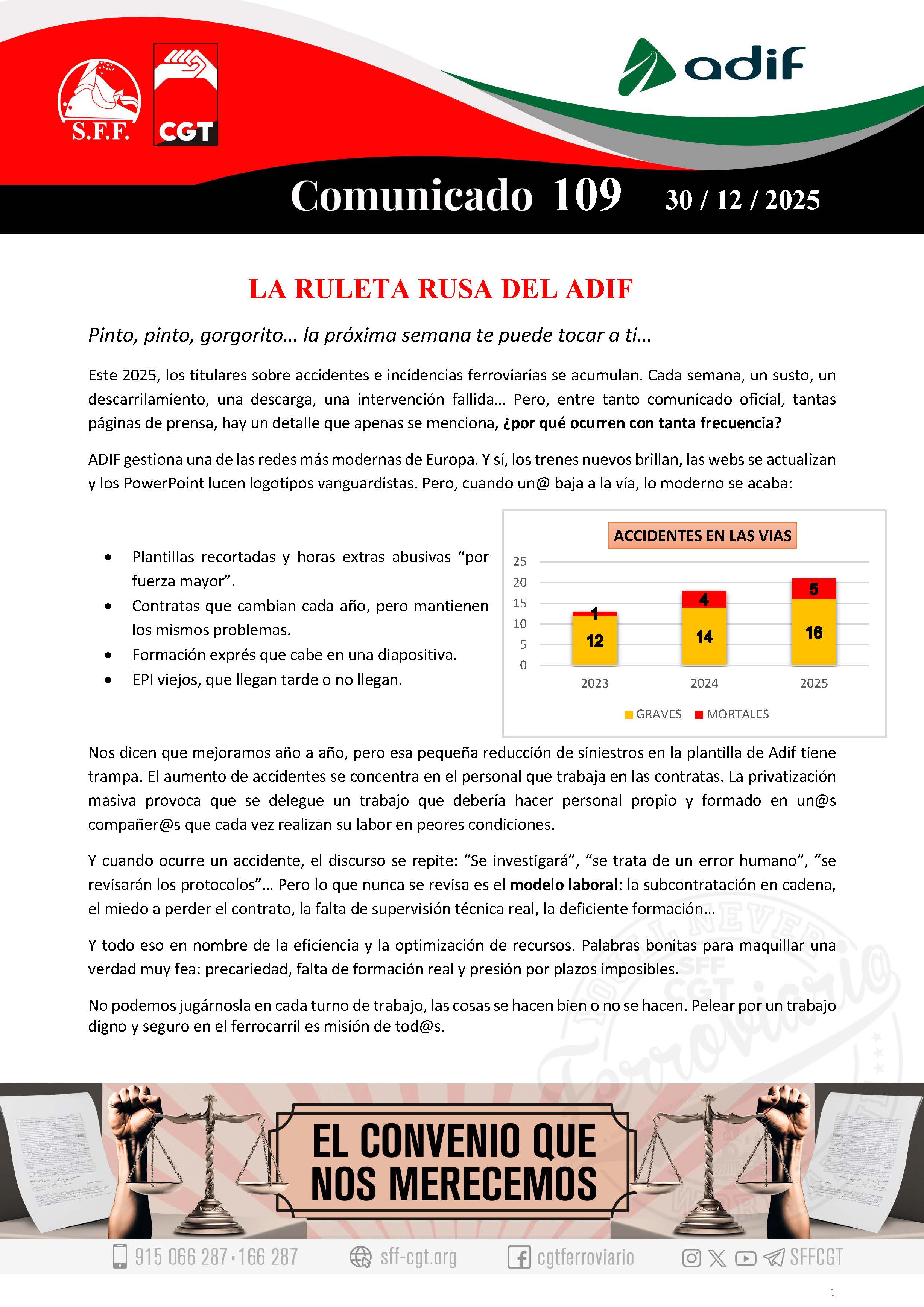 ADIF 18/12/2025 | 108 PARA CARNAVAL, NI CONVENIO NI ORDENACIÓN PROFESIONAL | RENFE 16/12/2025 | 107 PROPUESTA DEL SFF-CGT PARA UN SISTEMA DE MOVILIDAD CONTINUA CON GARANTÍAS |
