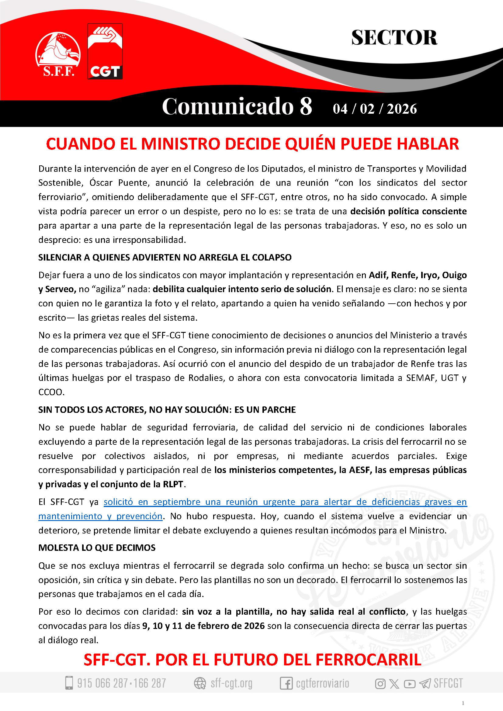 El SFF-CGT ya solicitó en septiembre una reunión urgente para alertar de deficiencias graves en mantenimiento y prevención. No hubo respuesta. Hoy, cuando el sistema vuelve a evidenciar un deterioro, se pretende limitar el debate excluyendo a quienes resultan incómodos para el Ministro.
