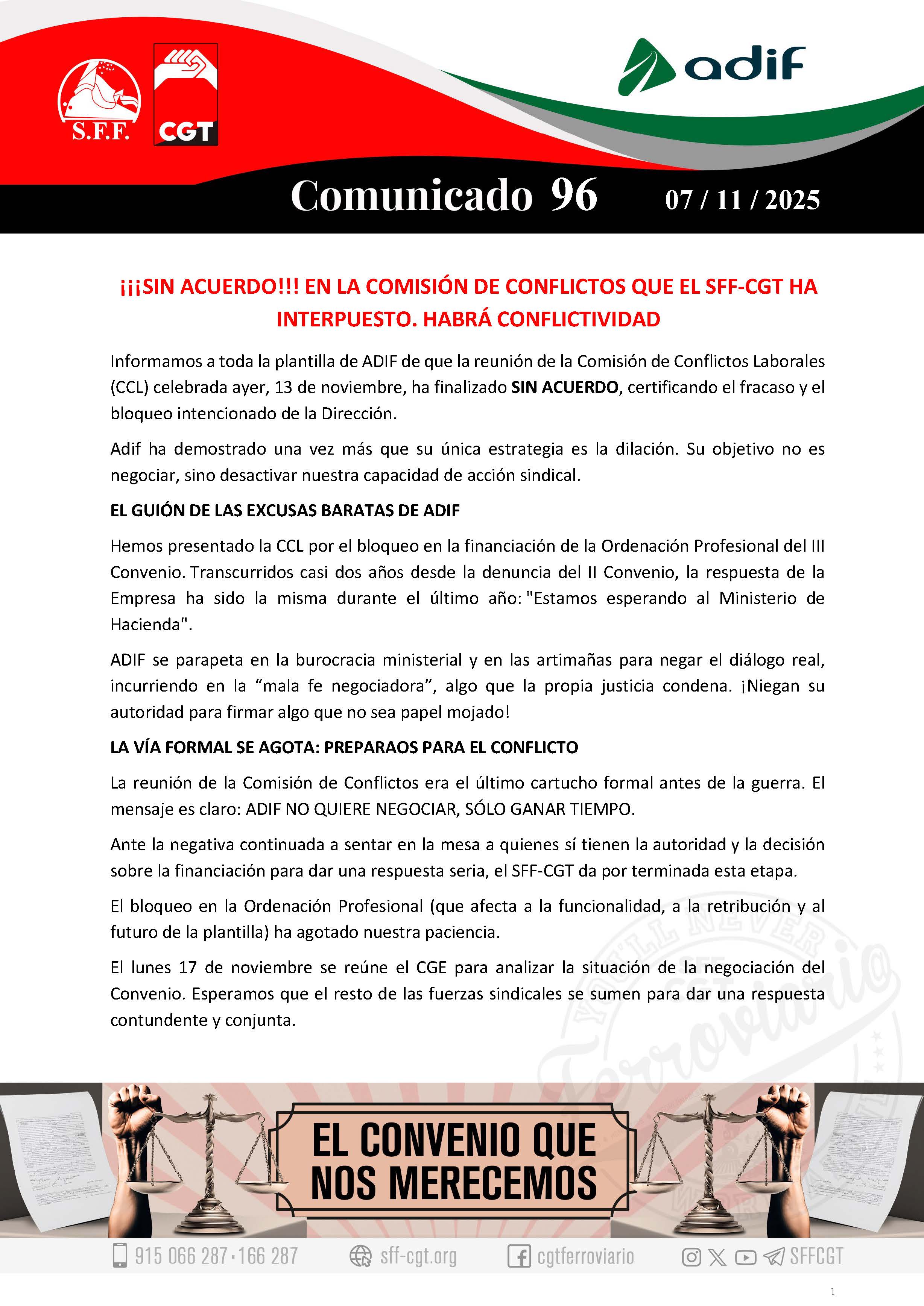Informamos a toda la plantilla de ADIF de que la reunión de la Comisión de Conflictos Laborales (CCL) celebrada ayer, 13 de noviembre, ha finalizado SIN ACUERDO, certificando el fracaso y el bloqueo intencionado de la Dirección.