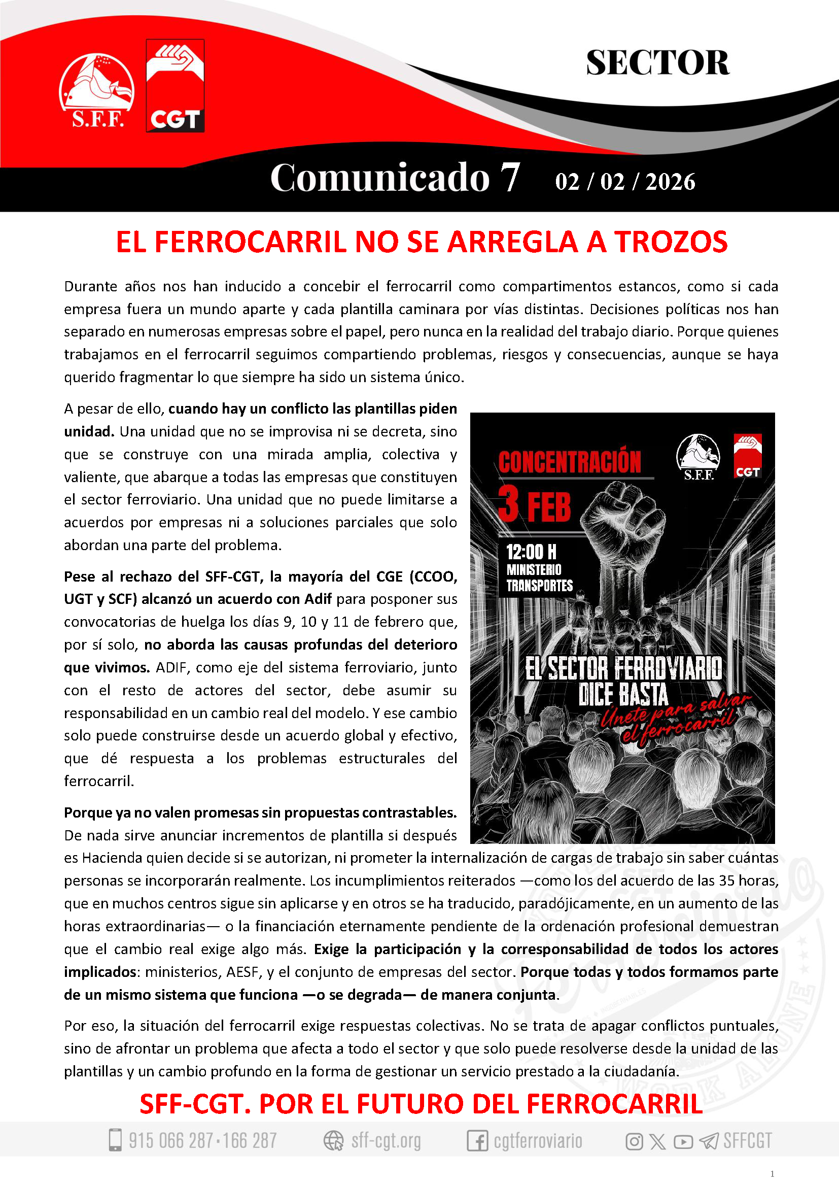 Pese al rechazo del SFF-CGT, la mayoría del CGE (CCOO, UGT y SCF) alcanzó un acuerdo con Adif para posponer sus convocatorias de huelga los días 9, 10 y 11 de febrero que, por sí solo, no aborda las causas profundas del deterioro que vivimos. ADIF, como eje del sistema ferroviario, junto con el resto de actores del sector, debe asumir su responsabilidad en un cambio real del modelo. Y ese cambio solo puede construirse desde un acuerdo global y efectivo, que dé respuesta a los problemas estructurales del ferrocarril.