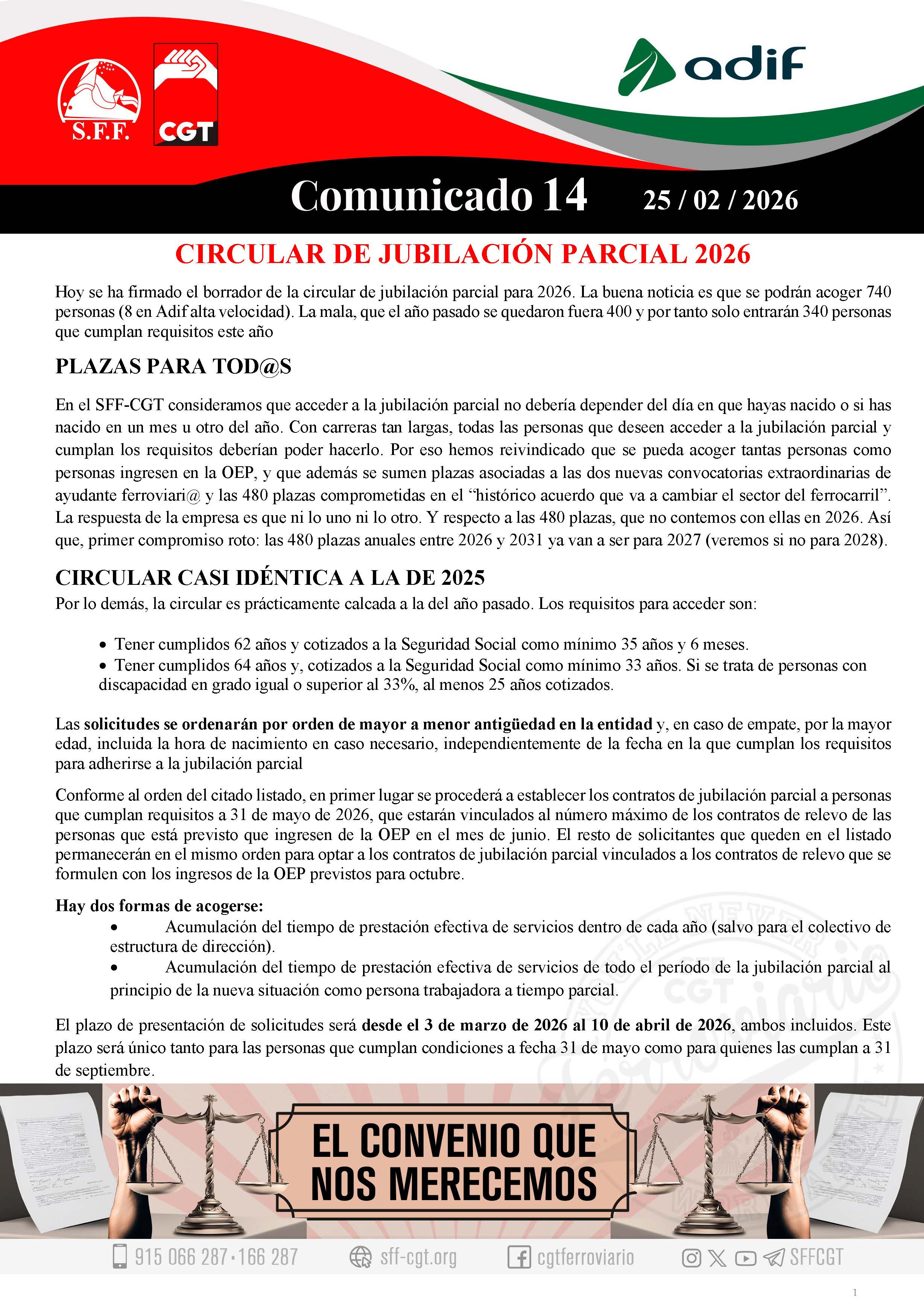 Hoy se ha firmado el borrador de la circular de jubilación parcial para 2026. La buena noticia es que se podrán acoger 740 personas (8 en Adif alta velocidad). La mala, que el año pasado se quedaron fuera 400 y por tanto solo entrarán 340 personas que cumplan requisitos este año.