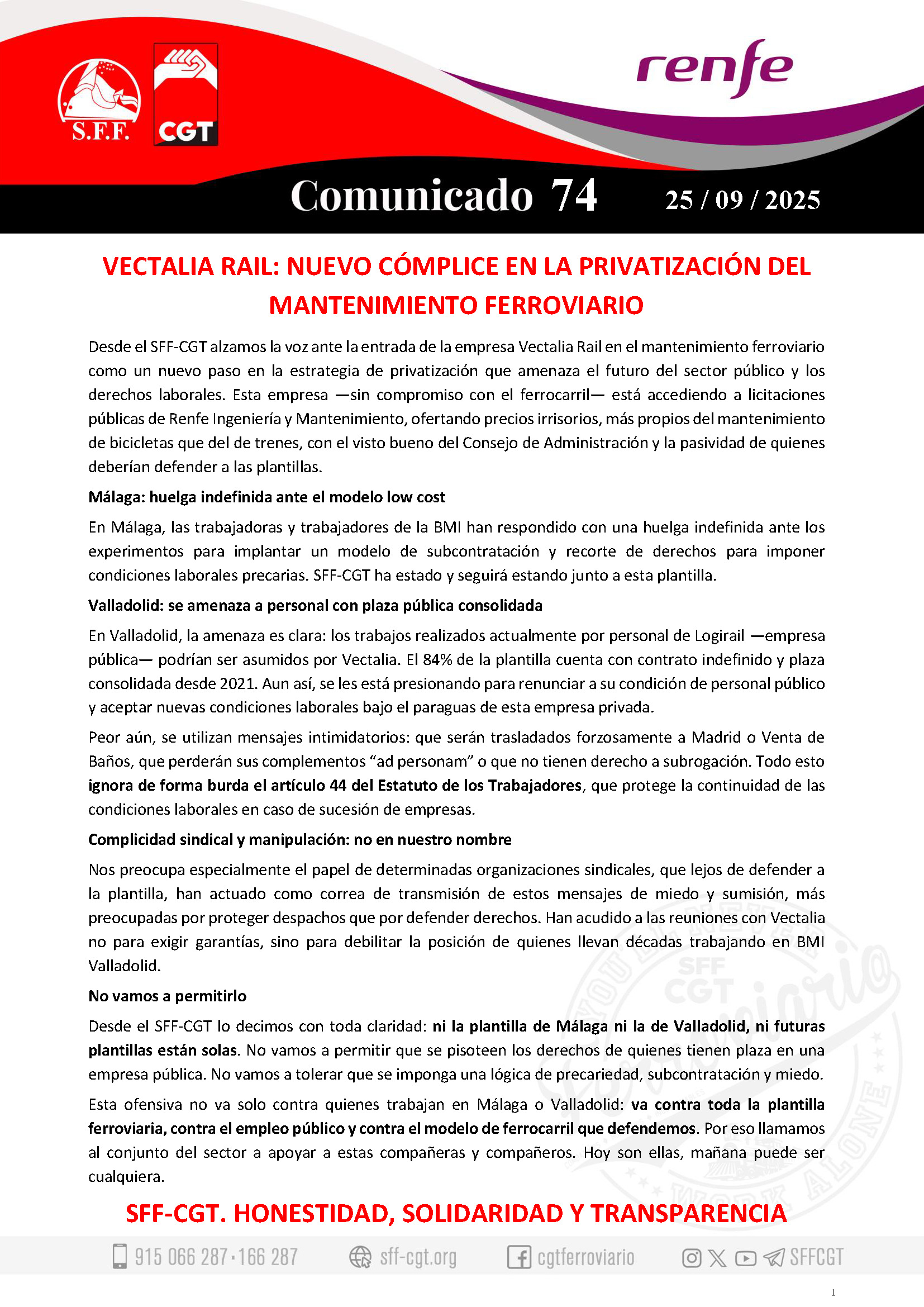 Desde el SFF-CGT lo decimos con toda claridad: ni la plantilla de Málaga ni la de Valladolid, ni futuras plantillas están solas. No vamos a permitir que se pisoteen los derechos de quienes tienen plaza en una empresa pública. No vamos a tolerar que se imponga una lógica de precariedad, subcontratación y miedo.
