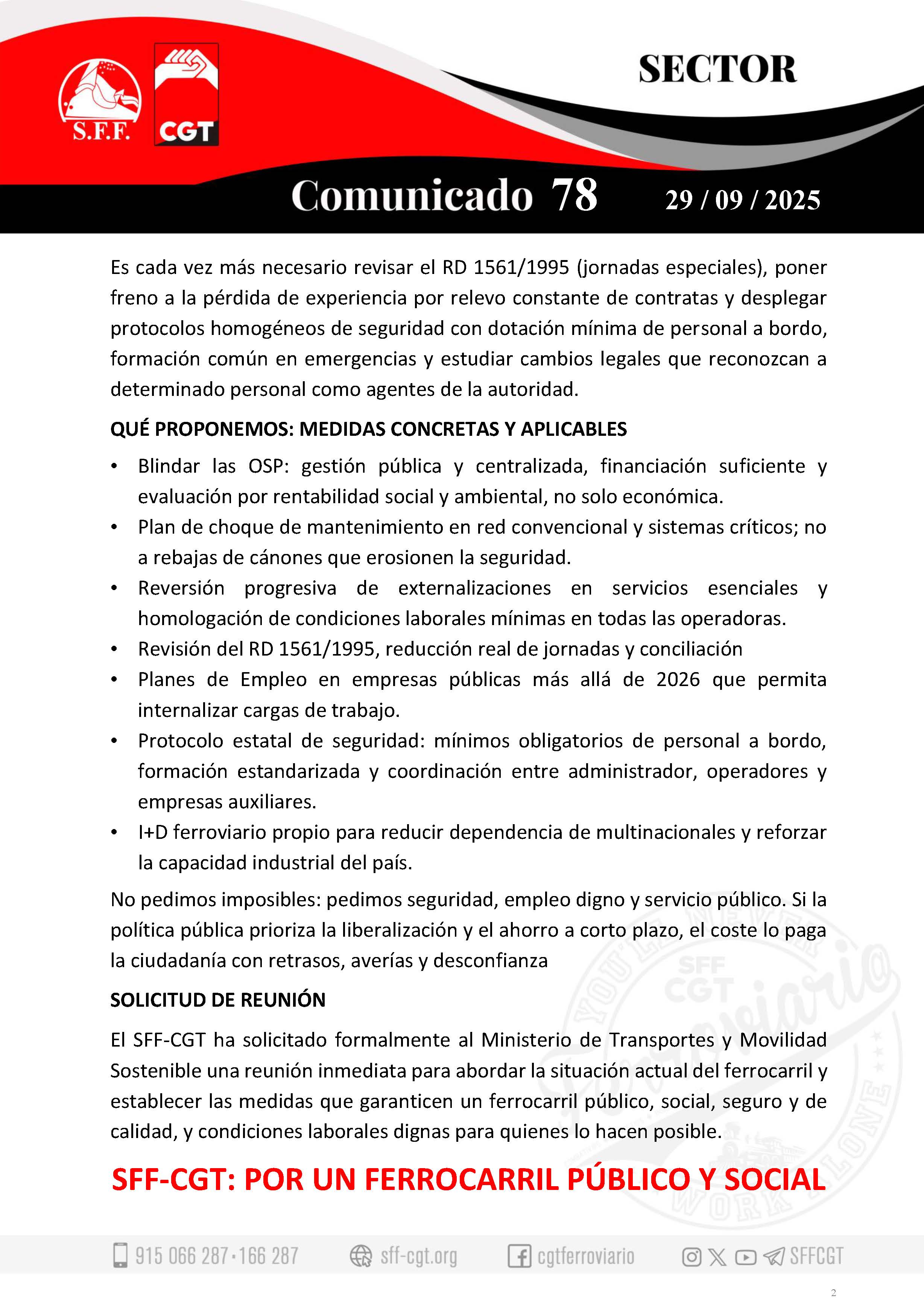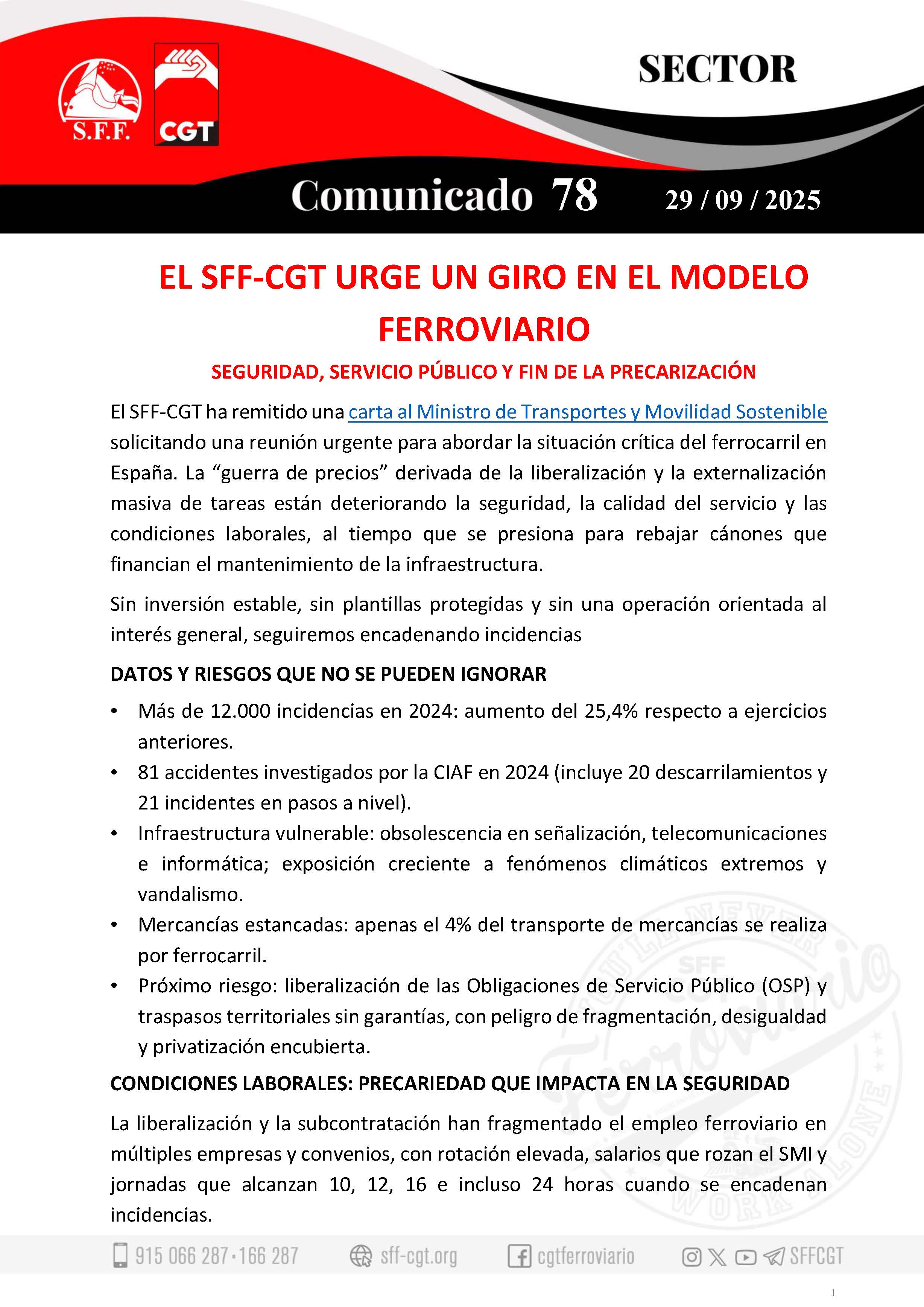 SECTOR EL SFF-CGT URGE UN GIRO EN EL MODELO FERROVIARIO SEGURIDAD, SERVICIO PÚBLICO Y FIN DE LA PRECARIZACIÓN | 78 2025-09-29 |