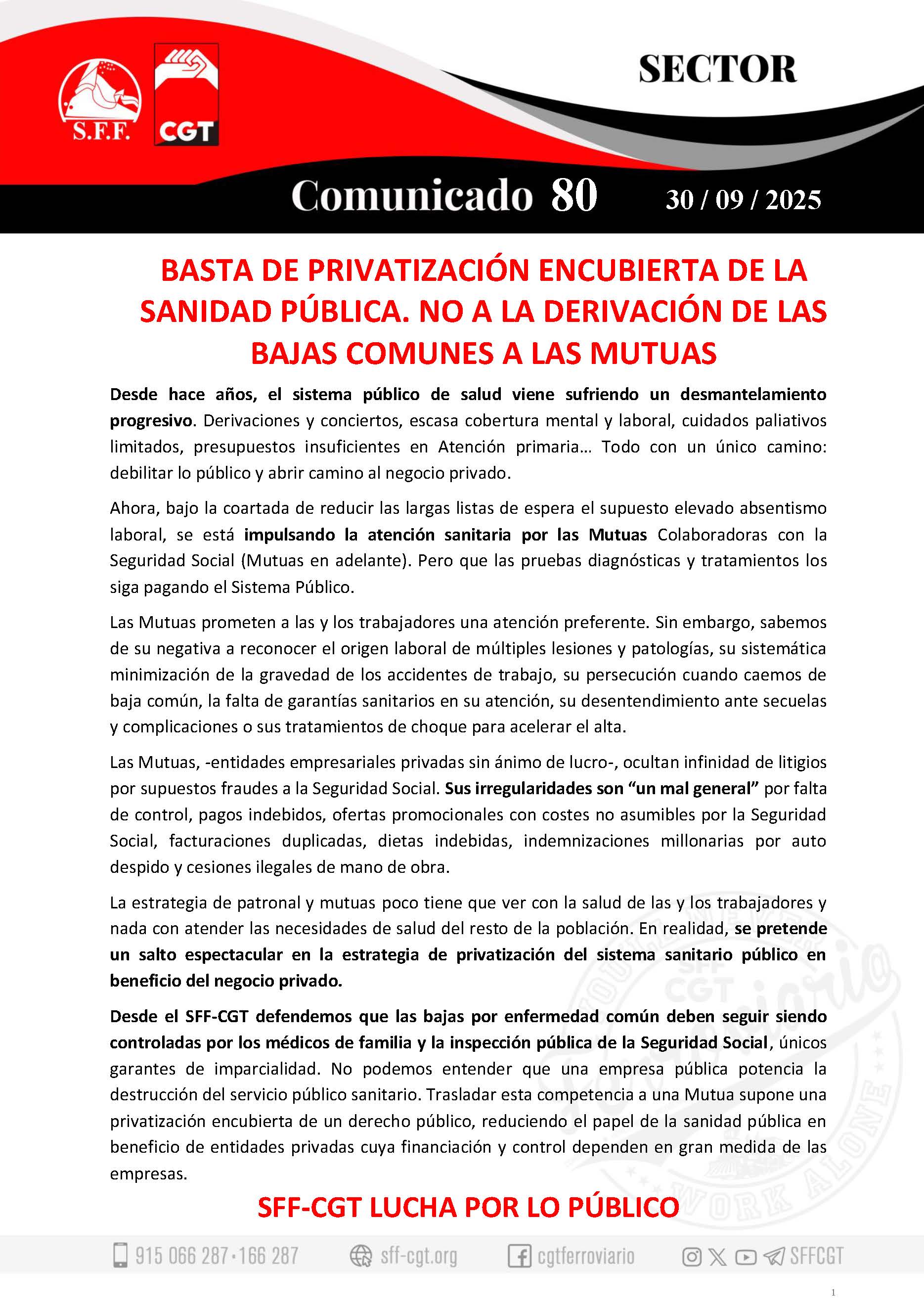 SECTOR BASTA DE PRIVATIZACIÓN ENCUBIERTA DE LA SANIDAD PÚBLICA. NO A LA DERIVACIÓN DE LAS BAJAS COMUNES A LAS MUTUAS | 80 2025-09-30 |