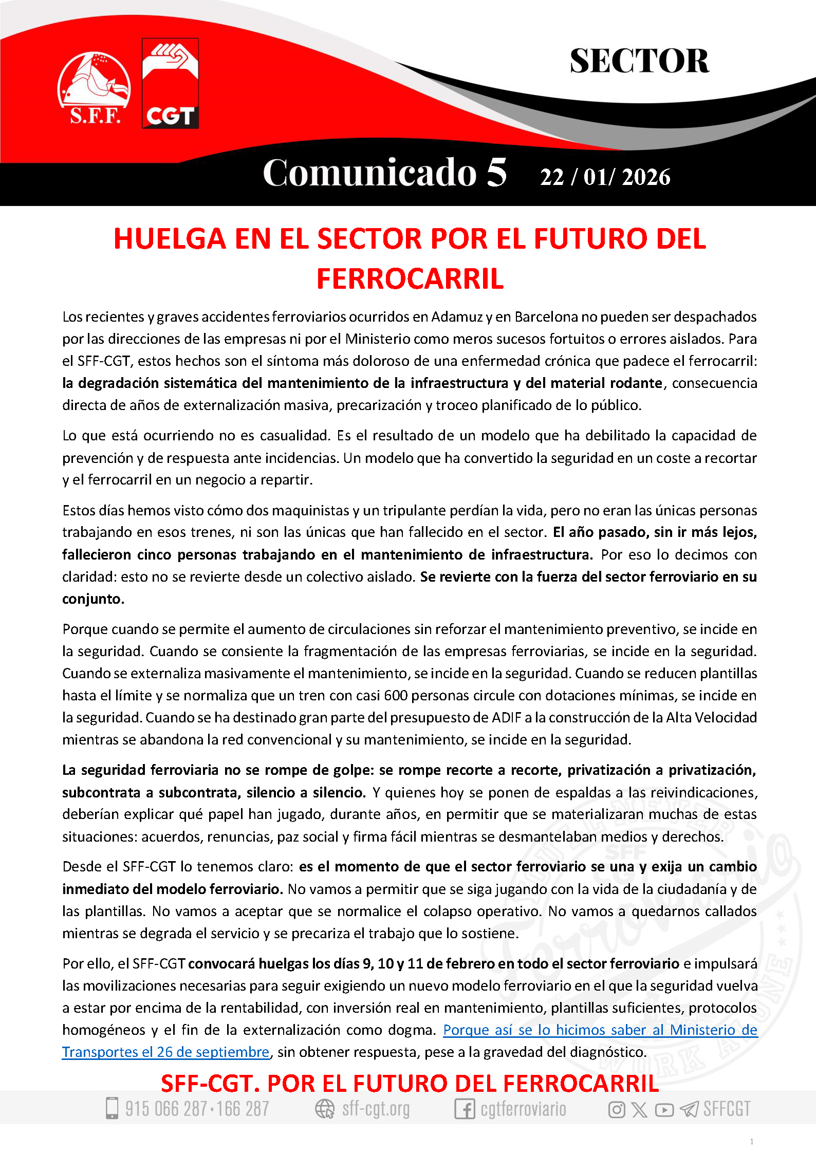 Los recientes y graves accidentes ferroviarios ocurridos en Adamuz y en Barcelona no pueden ser despachados por las direcciones de las empresas ni por el Ministerio como meros sucesos fortuitos o errores aislados. Para el SFF-CGT, estos hechos son el síntoma más doloroso de una enfermedad crónica que padece el ferrocarril: la degradación sistemática del mantenimiento de la infraestructura y del material rodante, consecuencia directa de años de externalización masiva, precarización y troceo planificado de lo público.
